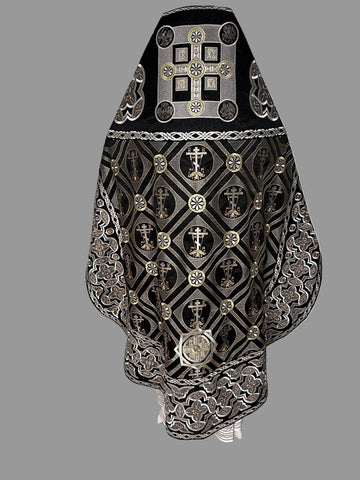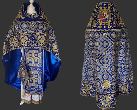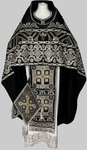 Silver/Gold and colour thread Embroidery.   Includes 5 items: Phelonion, Zone, Palitsa, Nabedrennik, Epitralhilion.  Available in all liturgical colours. Please refer to the measurement chart.